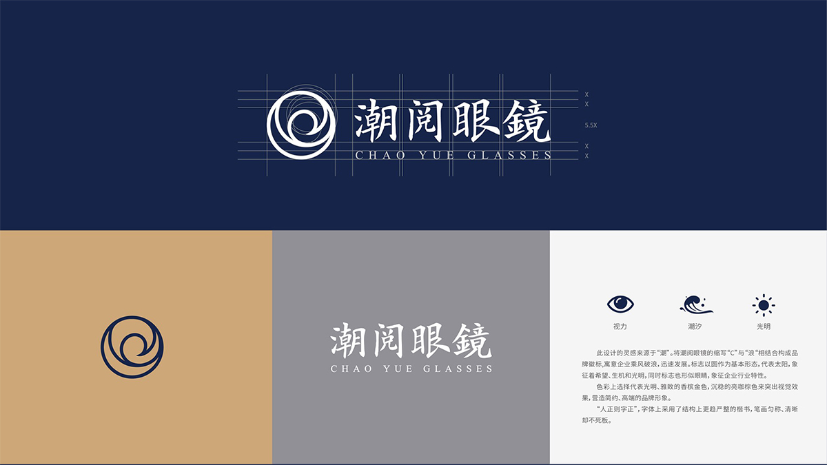 此設(shè)計(jì)的靈感來源于“潮”。將潮閱眼鏡的縮寫“C”與“潮“相結(jié)合構(gòu)成品牌徽標(biāo),寓意企業(yè)乘風(fēng)破浪,迅速發(fā)展。標(biāo)志以日出作為基本形態(tài),代表太陽,象征看希望、生機(jī)和光明,同時(shí)標(biāo)志也形似眼睛,象征企業(yè)行業(yè)特性。