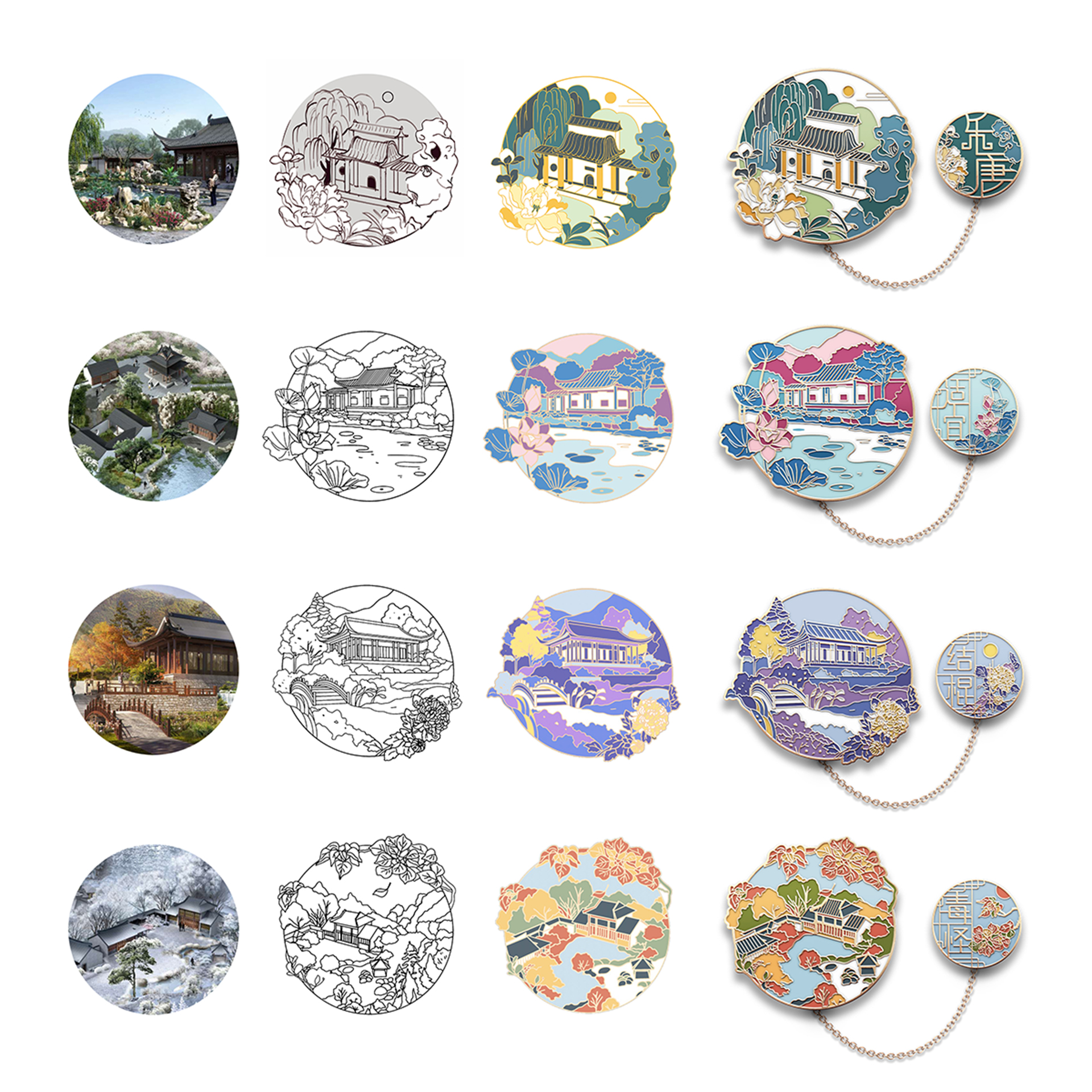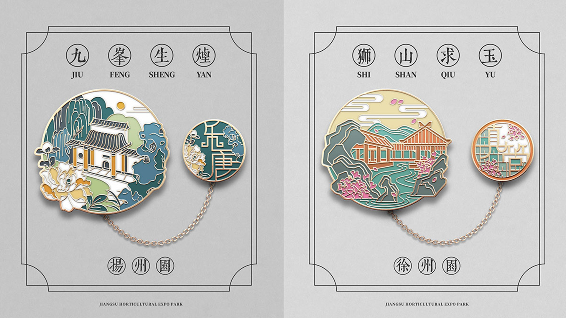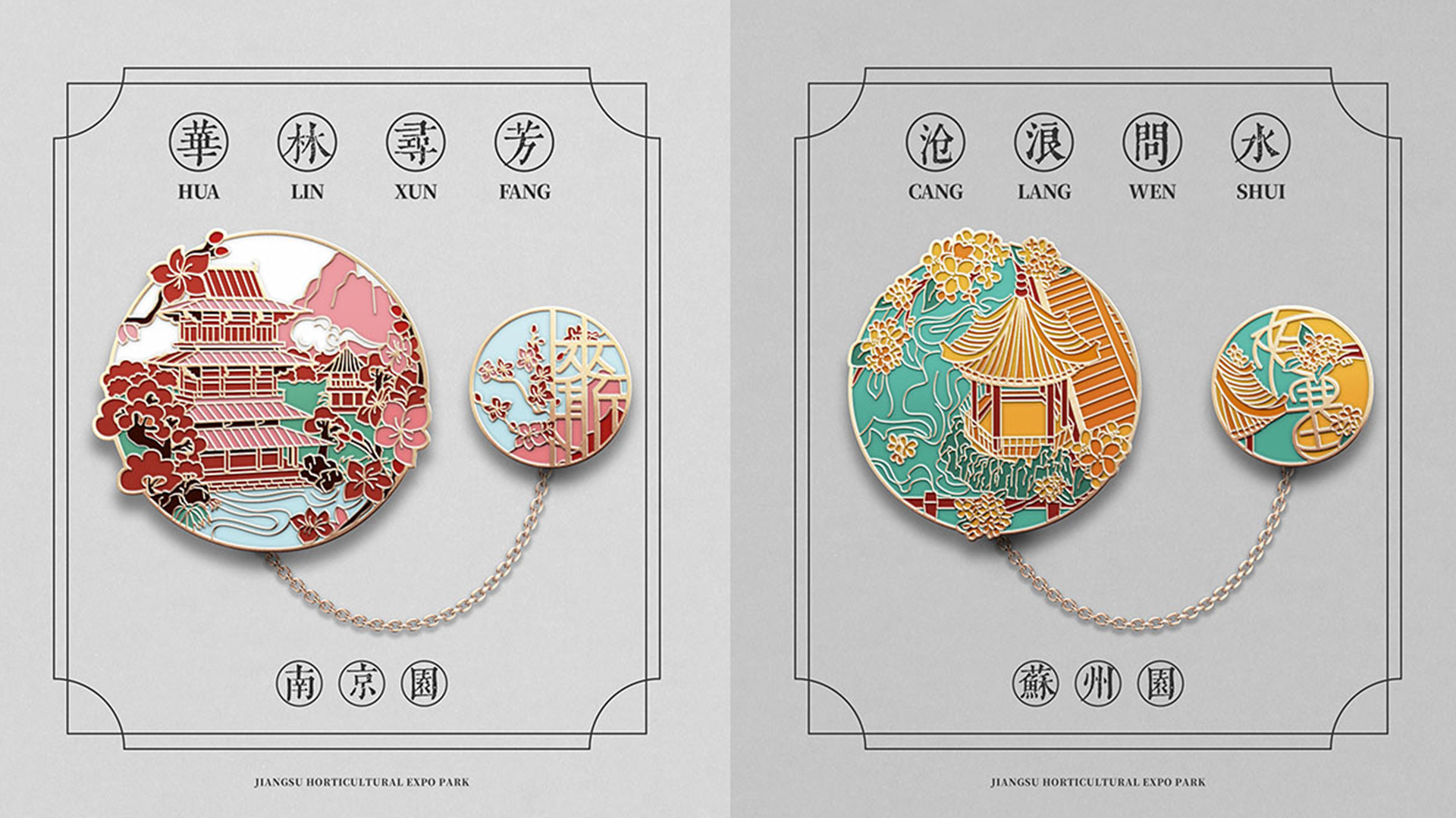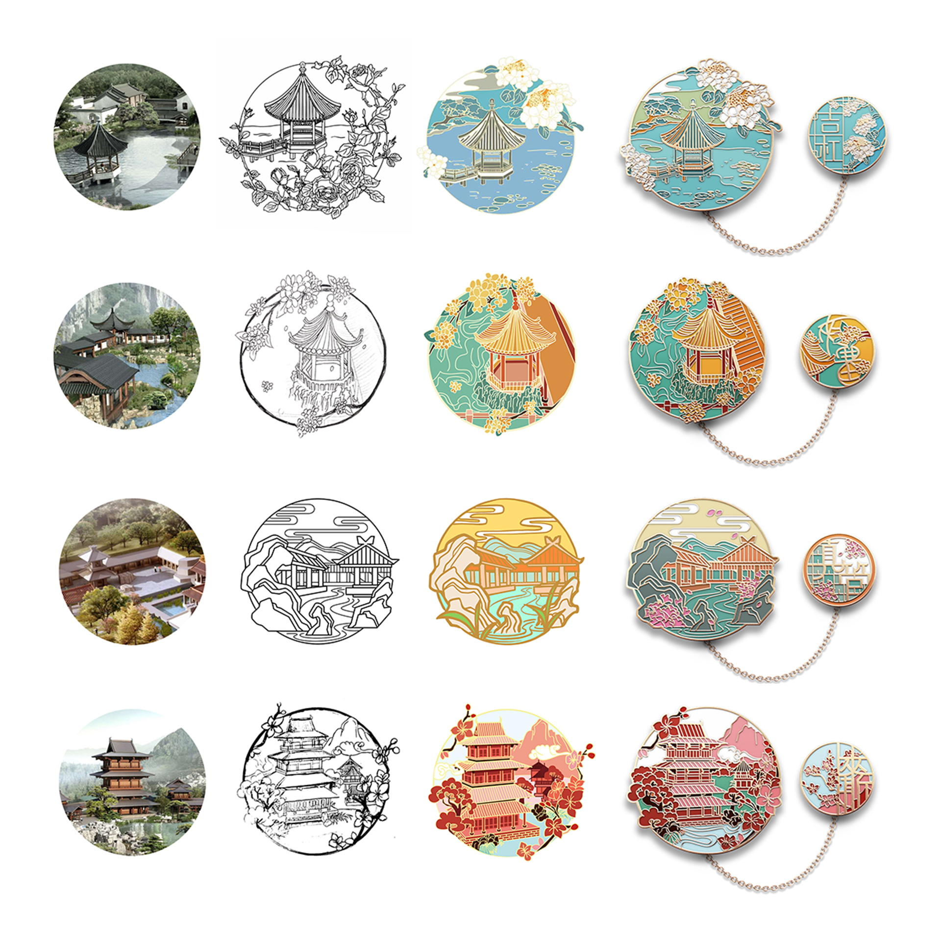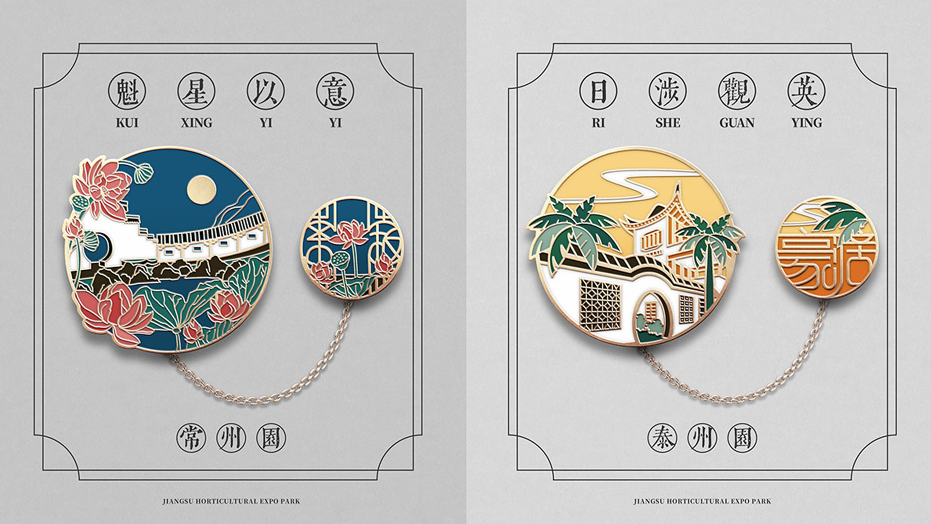 蘇韻薈谷·文創(chuàng)徽章:蘇韻薈谷徽章系列以江蘇省十三市經(jīng)典園林建筑為靈感,分別融入各地代表美好寓意的特色方言,從傳統(tǒng)園林窗花切入,運(yùn)用視覺立體化手法,形成具有地方特色的徽章視覺體系。