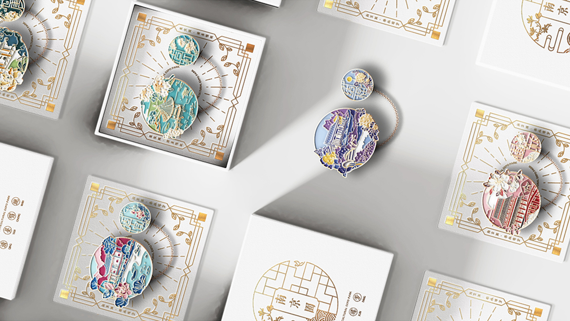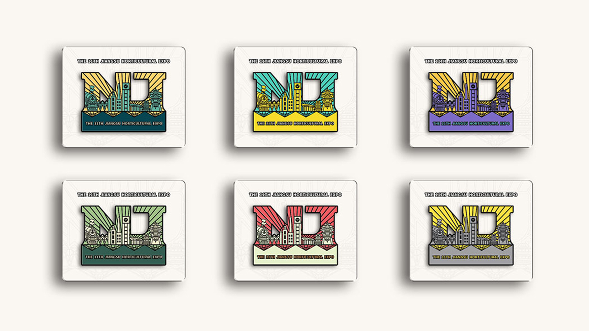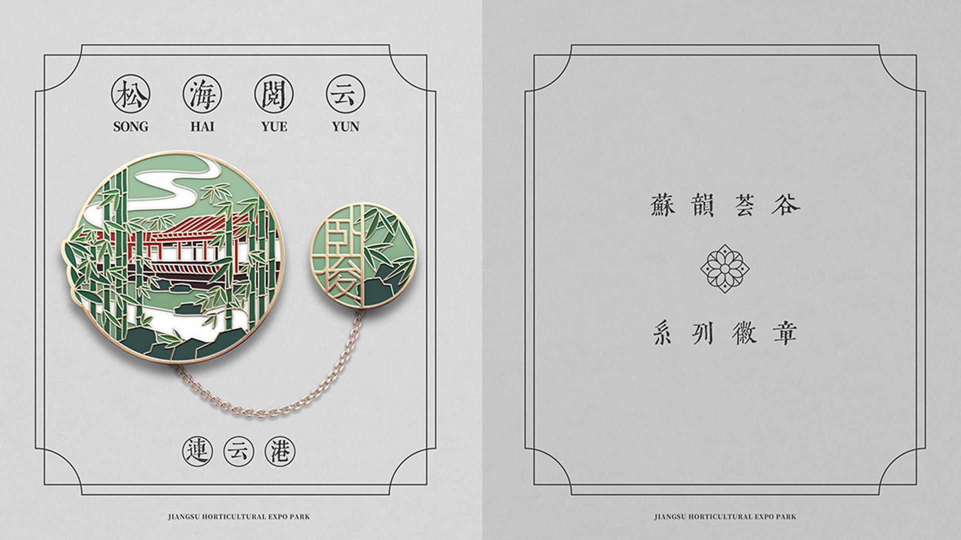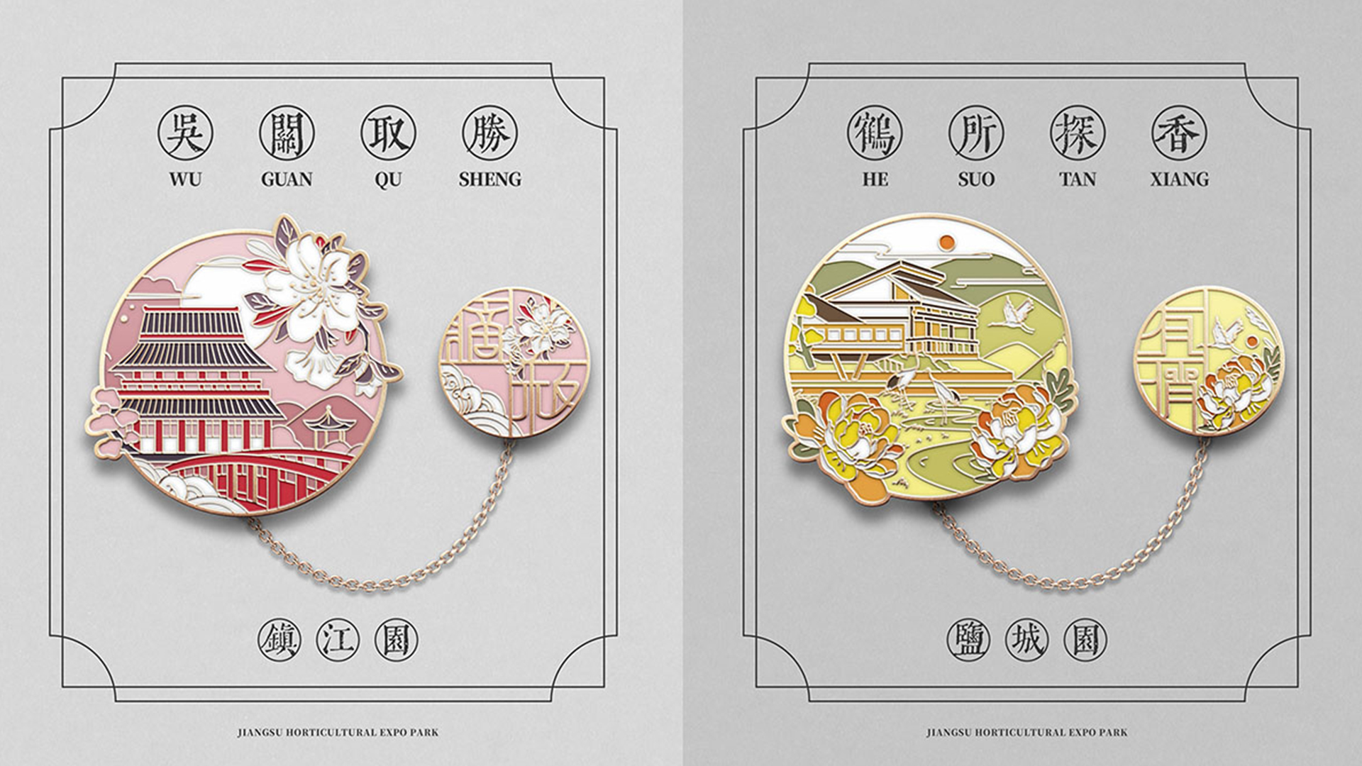 蘇韻薈谷·文創(chuàng)徽章:蘇韻薈谷徽章系列以江蘇省十三市經(jīng)典園林建筑為靈感,分別融入各地代表美好寓意的特色方言,從傳統(tǒng)園林窗花切入,運(yùn)用視覺立體化手法,形成具有地方特色的徽章視覺體系。