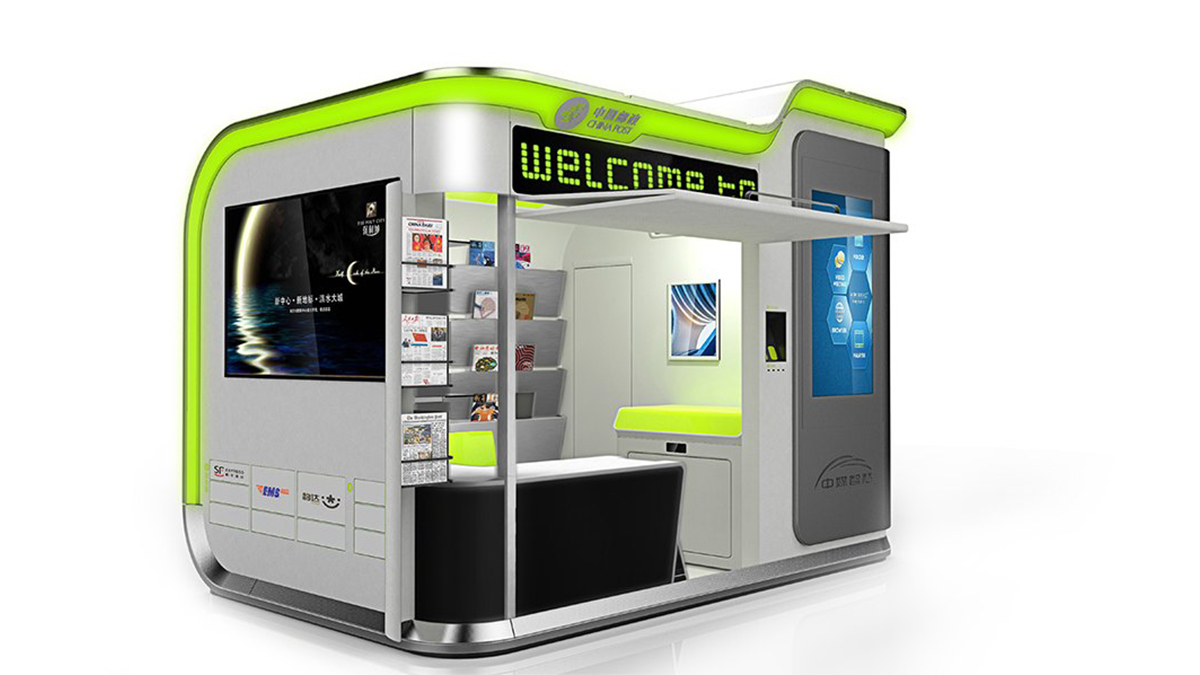 造型以現(xiàn)代簡(jiǎn)約風(fēng)格為主,順應(yīng)現(xiàn)代市場(chǎng)和審美需求。簡(jiǎn)潔的外觀、內(nèi)部流暢的曲線和燈光效果相呼應(yīng),凸顯產(chǎn)品的科技感同時(shí)又不顯得沉悶。多功能和模塊化設(shè)計(jì)更是人性化設(shè)計(jì)的主要體現(xiàn),由形式至意,從意到神韻,無不強(qiáng)調(diào)中國(guó)郵政的服務(wù)宗旨,以人為本。