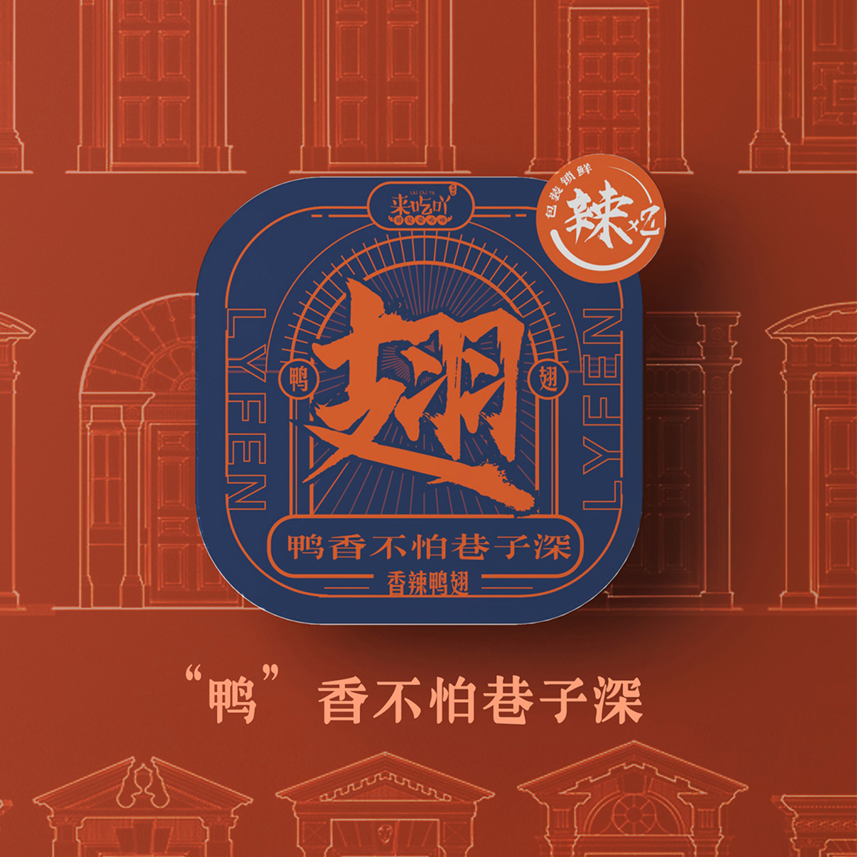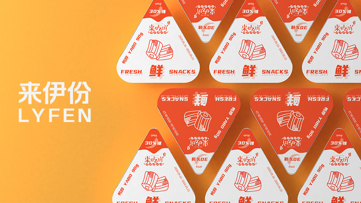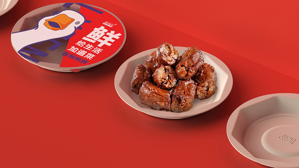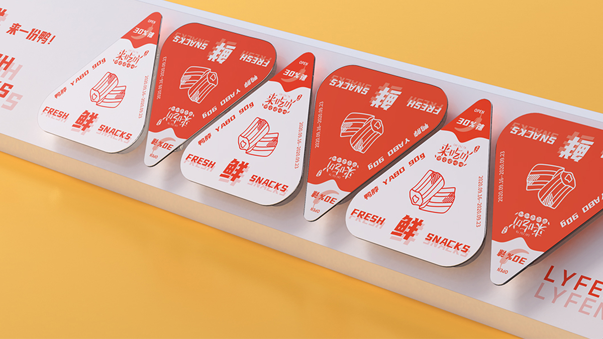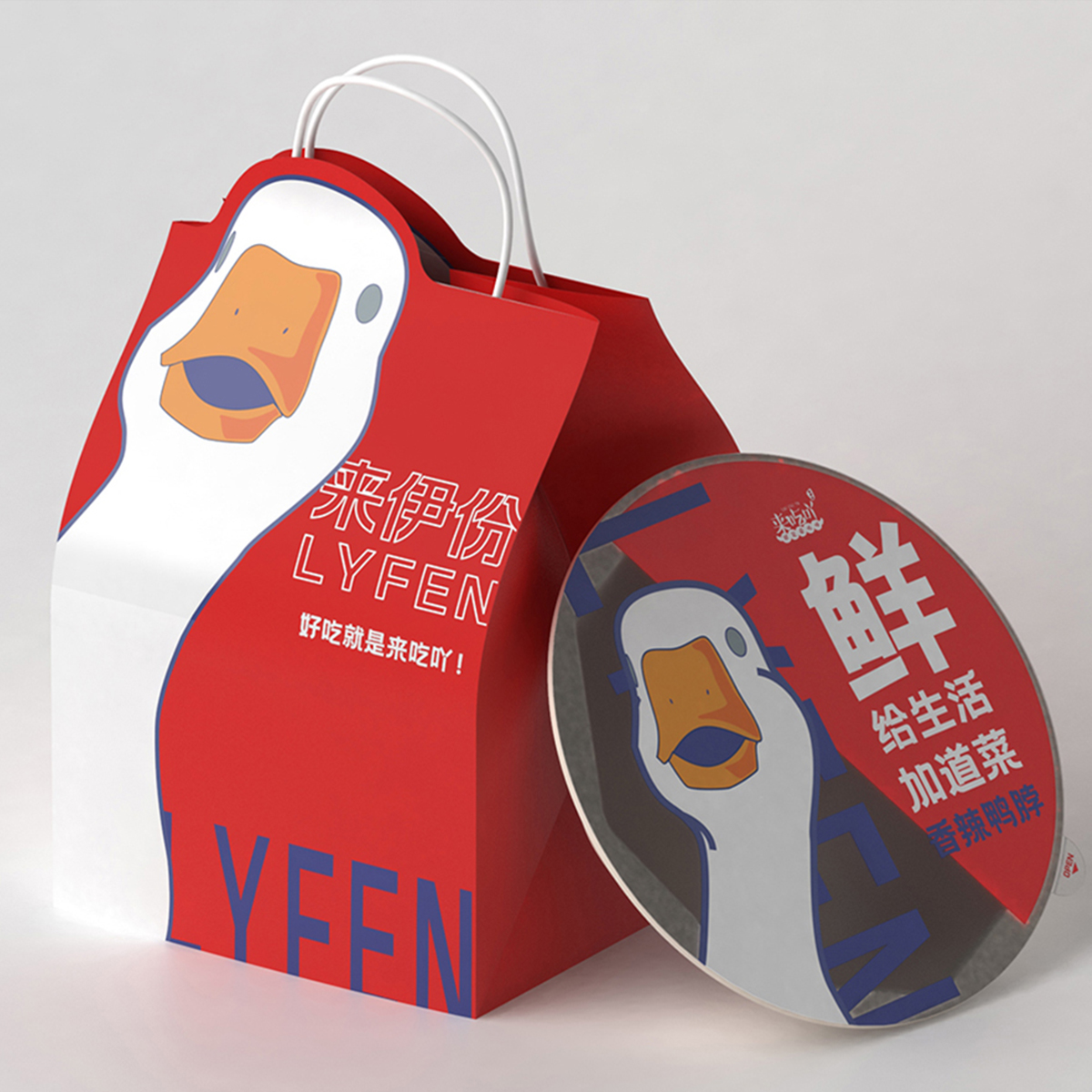來伊份-給生活加道菜:八邊食盒,為味覺錦上添花。采用了中國傳統(tǒng)餐具錦盒的八邊造型,八也象征著八方來客,兼容并蓄,雅俗共賞的包容態(tài)度,與來伊份的品牌文化相符。底部貼紙內(nèi)附紙巾手套包,提升消費者食用體驗?;盍︴r食,運用高飽和的明艷色彩和可愛年輕的鴨子形象提升視覺吸引力。