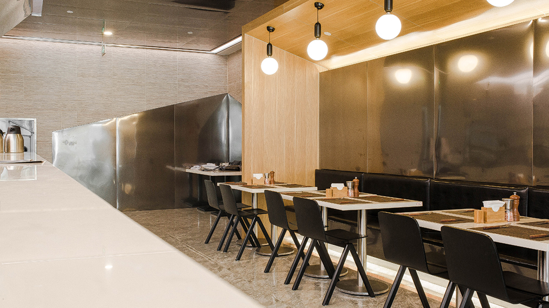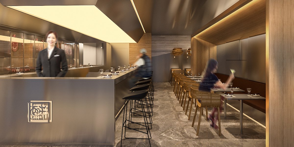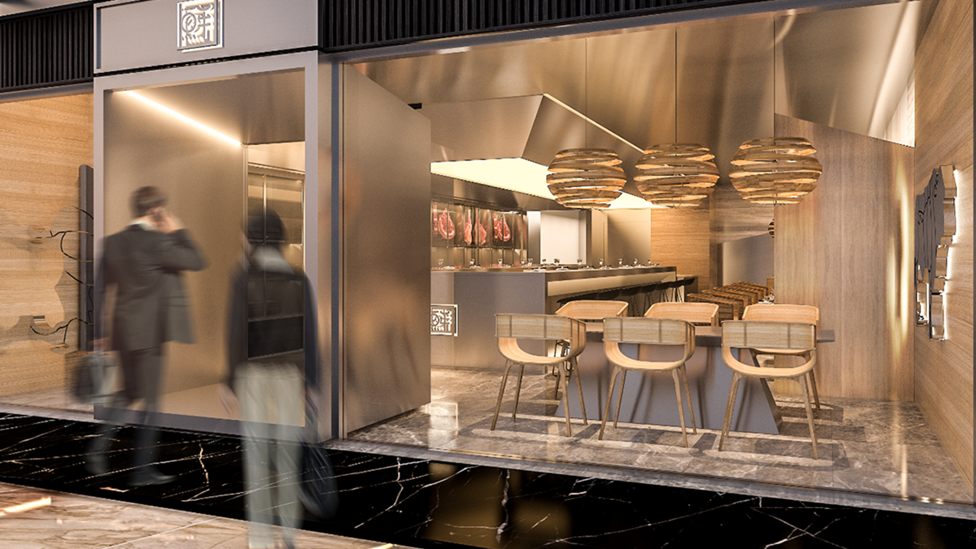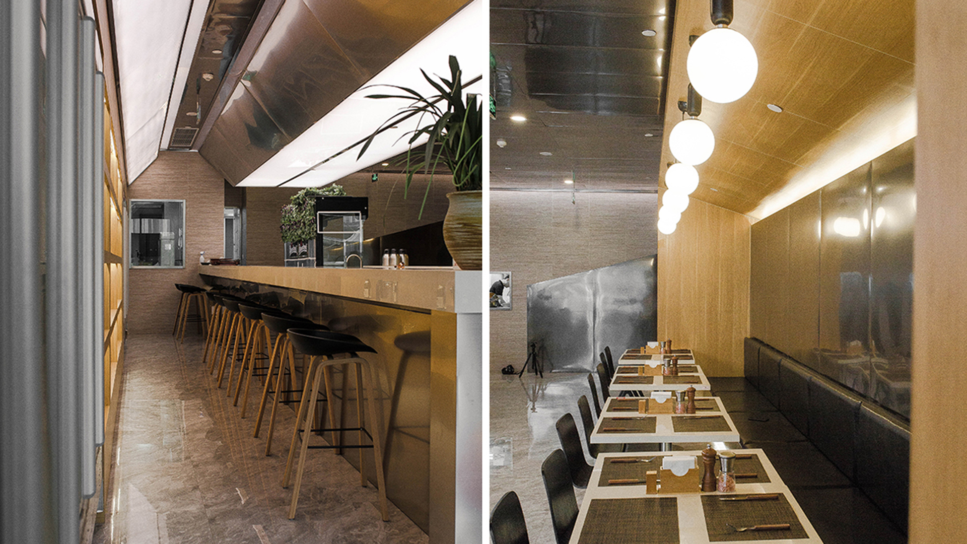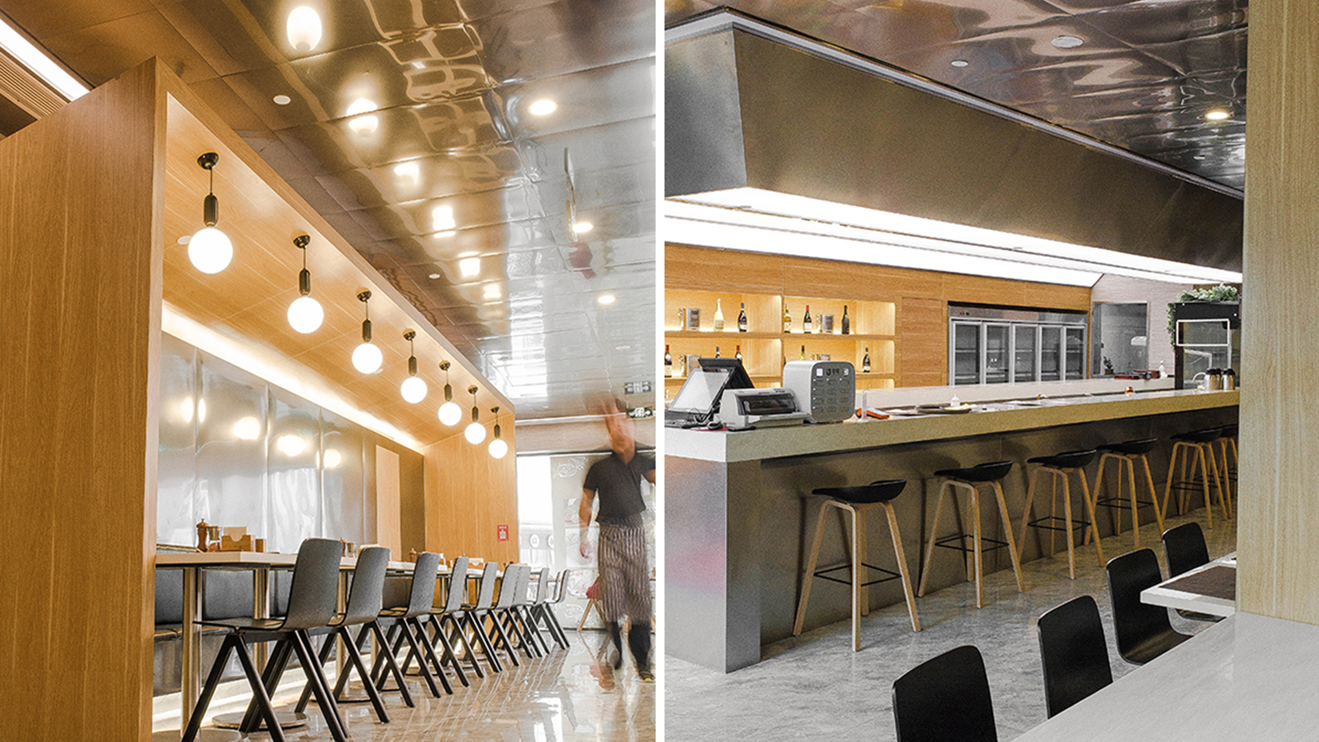該餐廳著眼于新中產(chǎn)階級(jí)的生活定義,以回味自然(沉浸于自然的環(huán)抱,享受自然的美食藝術(shù))和實(shí)驗(yàn)留鮮(用科研的精神留住新鮮,不辜負(fù)自然的美食饋贈(zèng))的概念定位,結(jié)合設(shè)計(jì)美學(xué),融合了西方飲食文化影響的現(xiàn)代設(shè)計(jì)方式,為美食和顧客的沉浸式體驗(yàn)營(yíng)造了一處健康且又時(shí)尚精致的環(huán)境。對(duì)易見鮮而言,設(shè)計(jì)借助較小的體量捕獲一種簡(jiǎn)約自然但又豐富、精細(xì)的美學(xué)。大面積的不銹鋼板用于天花飾面裝飾,限定了餐廳開放區(qū)域。狹長(zhǎng)大面積的片狀頂燈懸掛在中央吧臺(tái)區(qū)域。這一強(qiáng)有力的空間元素有助于劃分空間、集中照明同時(shí)吸引餐廳內(nèi)外的目光,成為整個(gè)空間核心焦點(diǎn)。通過廚房的直接開放,為客戶展現(xiàn)正確的牛排烹飪方式,用餐體驗(yàn)得到進(jìn)一步提升,讓來自廚房的活力滲透到整個(gè)餐廳。