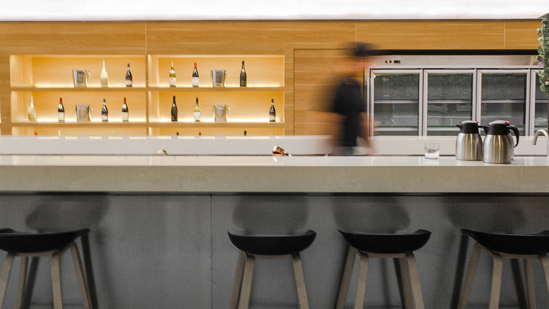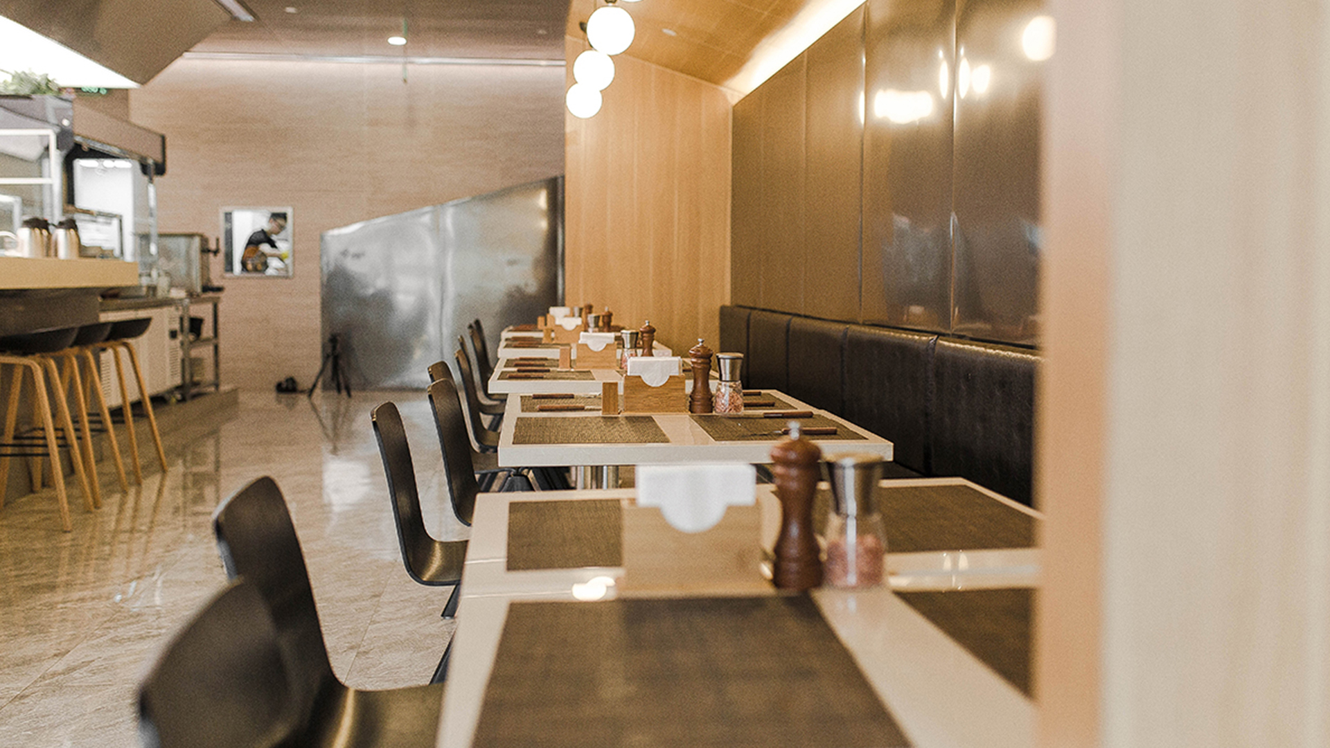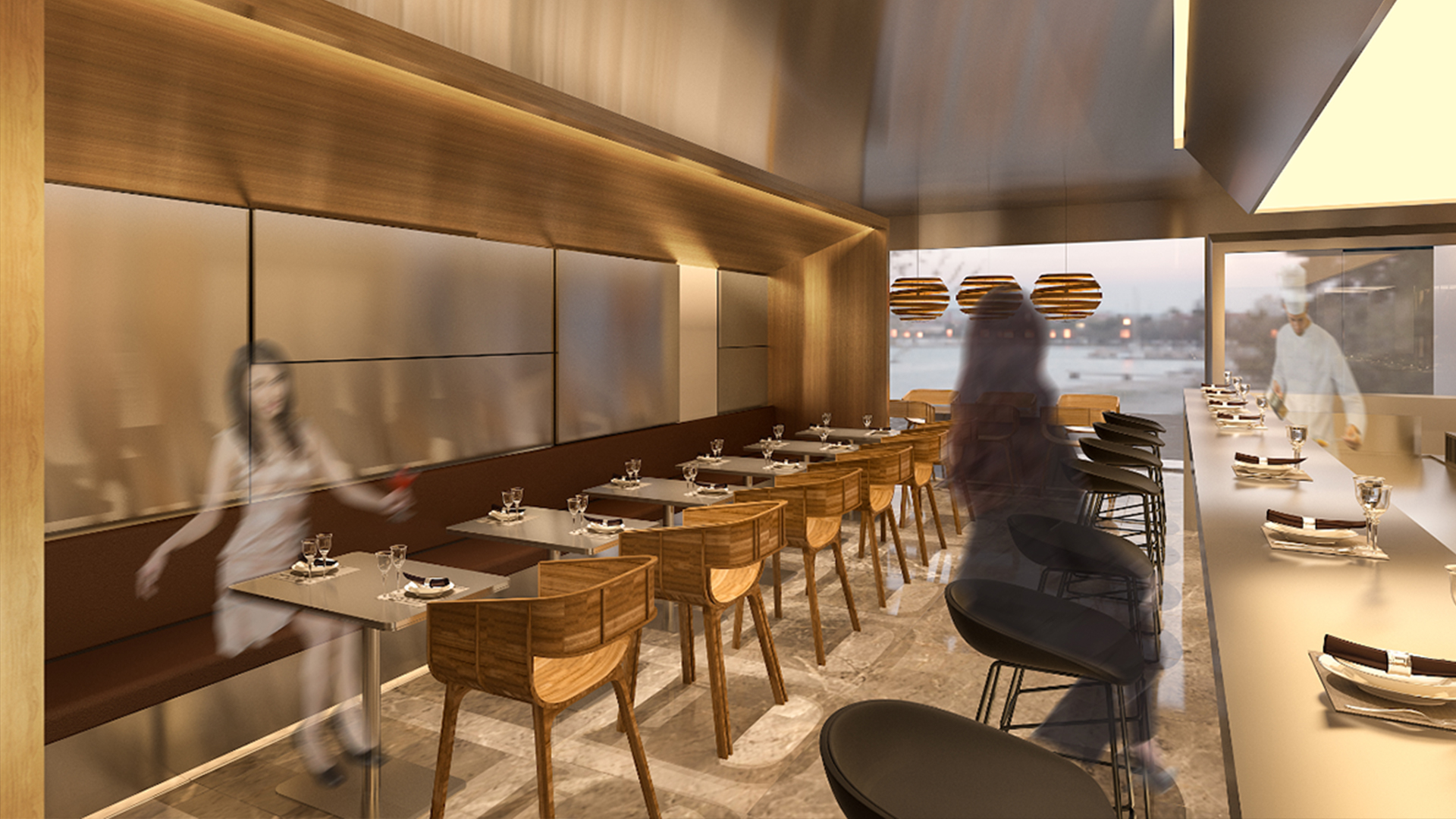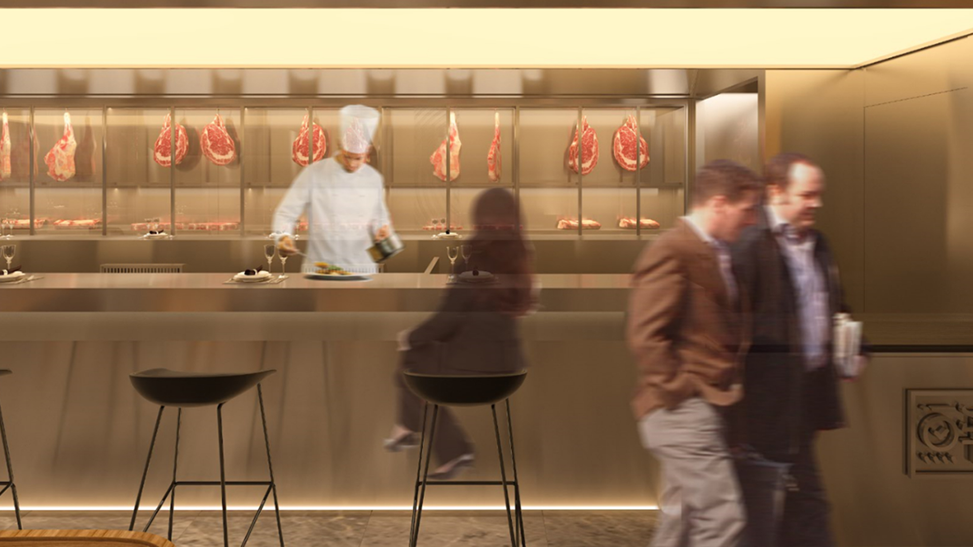 該餐廳著眼于新中產(chǎn)階級(jí)的生活定義,以回味自然(沉浸于自然的環(huán)抱,享受自然的美食藝術(shù))和實(shí)驗(yàn)留鮮(用科研的精神留住新鮮,不辜負(fù)自然的美食饋贈(zèng))的概念定位,結(jié)合設(shè)計(jì)美學(xué),融合了西方飲食文化影響的現(xiàn)代設(shè)計(jì)方式,為美食和顧客的沉浸式體驗(yàn)營(yíng)造了一處健康且又時(shí)尚精致的環(huán)境。對(duì)易見鮮而言,設(shè)計(jì)借助較小的體量捕獲一種簡(jiǎn)約自然但又豐富、精細(xì)的美學(xué)。大面積的不銹鋼板用于天花飾面裝飾,限定了餐廳開放區(qū)域。狹長(zhǎng)大面積的片狀頂燈懸掛在中央吧臺(tái)區(qū)域。這一強(qiáng)有力的空間元素有助于劃分空間、集中照明同時(shí)吸引餐廳內(nèi)外的目光,成為整個(gè)空間核心焦點(diǎn)。通過廚房的直接開放,為客戶展現(xiàn)正確的牛排烹飪方式,用餐體驗(yàn)得到進(jìn)一步提升,讓來自廚房的活力滲透到整個(gè)餐廳。