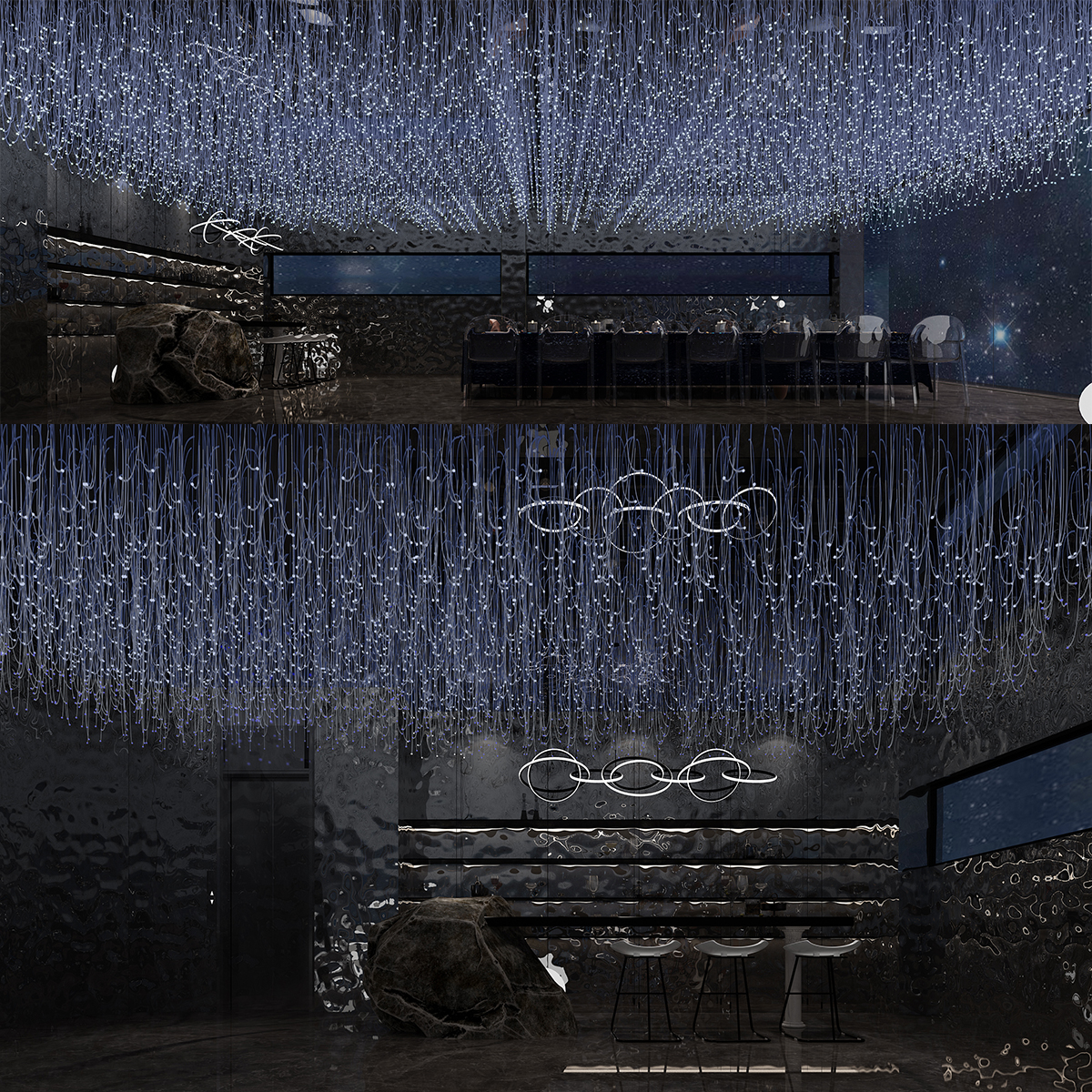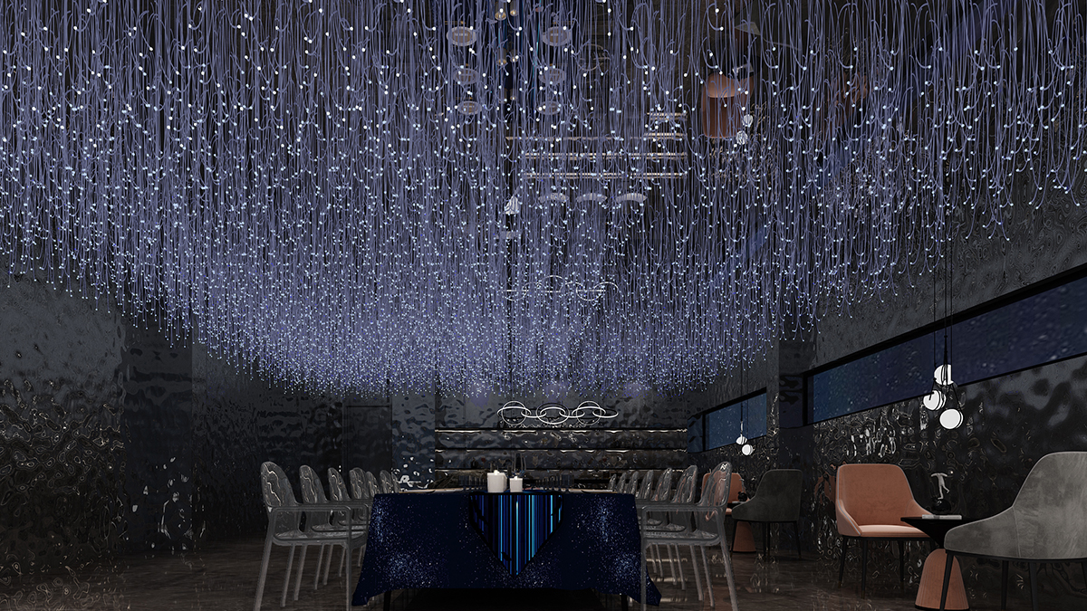 餐廳內(nèi)垂掛起無數(shù)盞LED燈,用來營造一種夢(mèng)幻星空的環(huán)境,星光熠熠,讓你感覺到仿佛置身于“星空”之中。