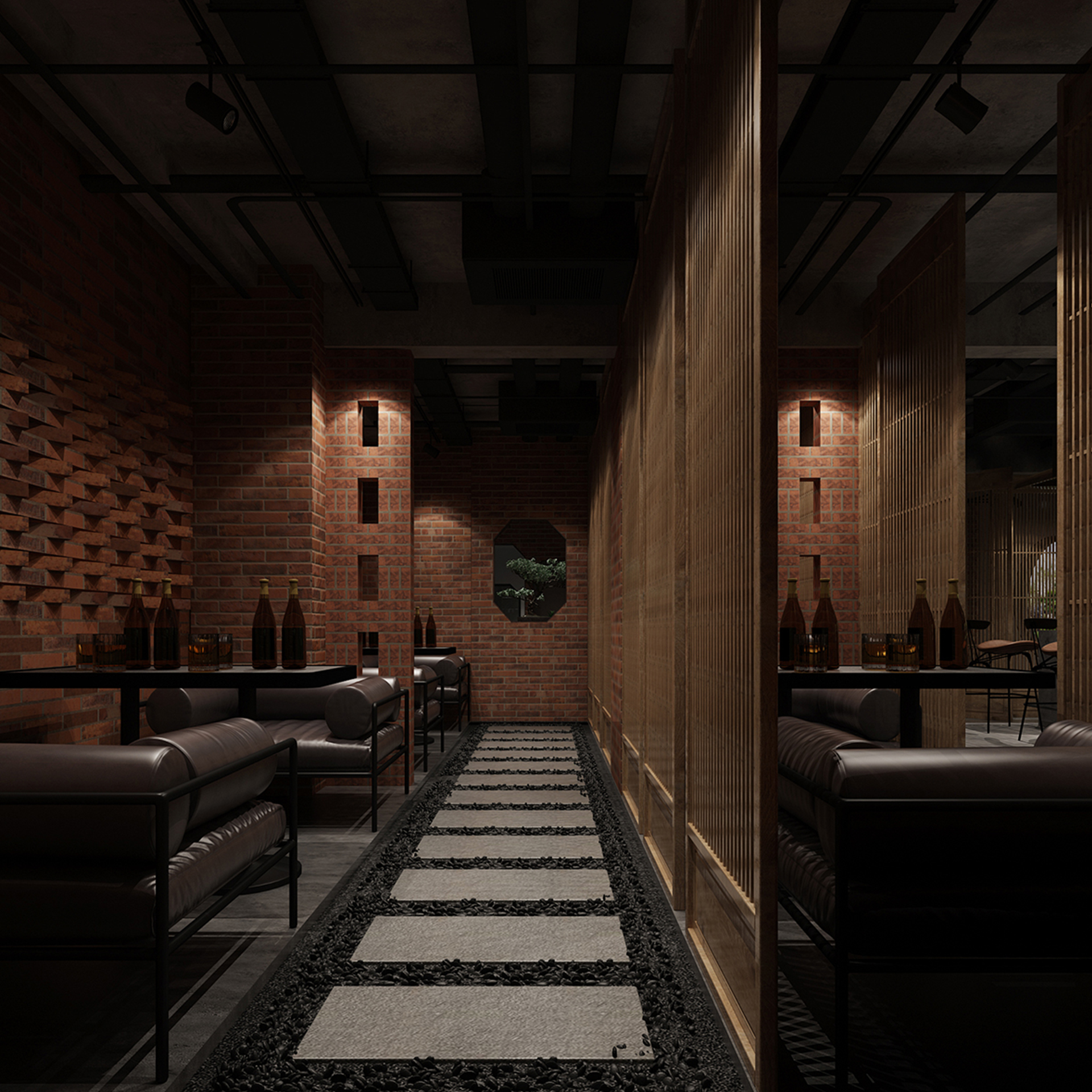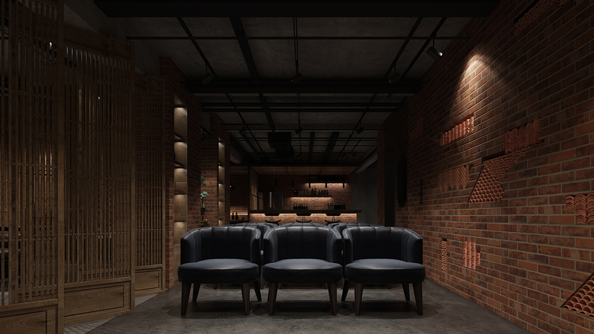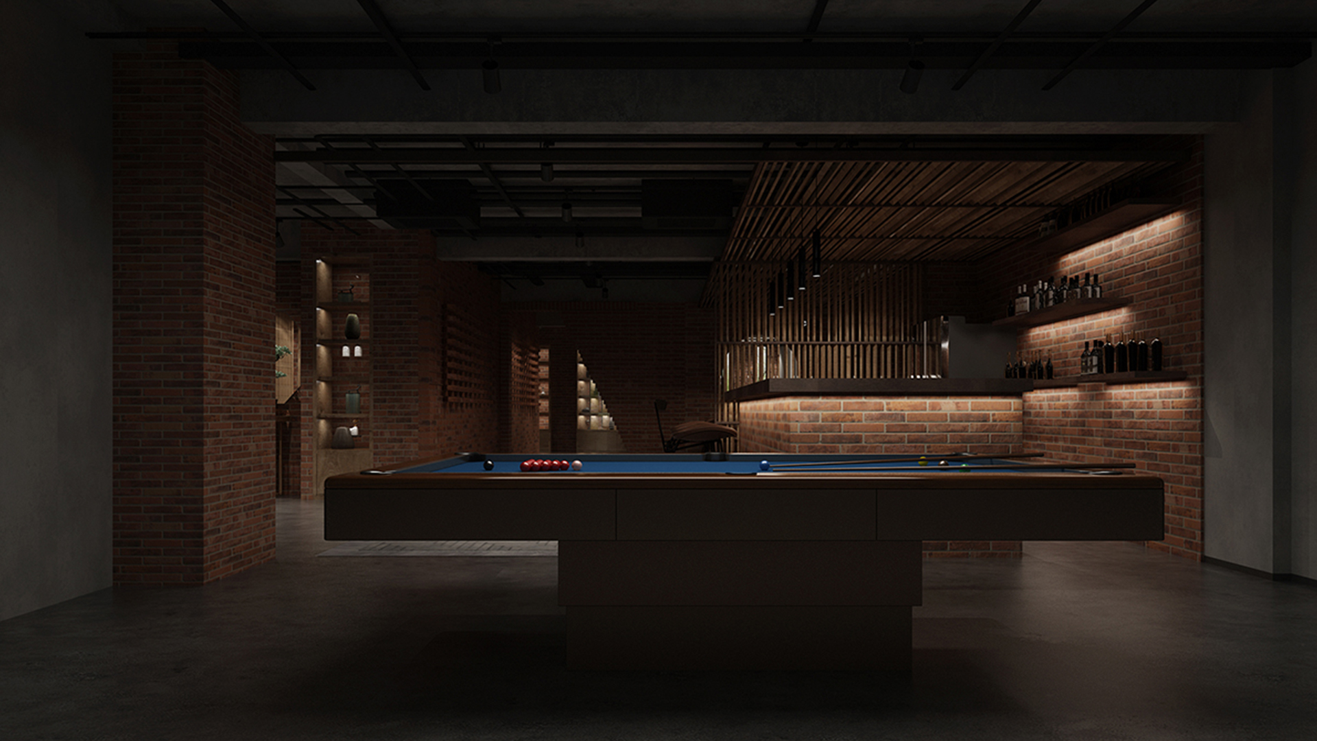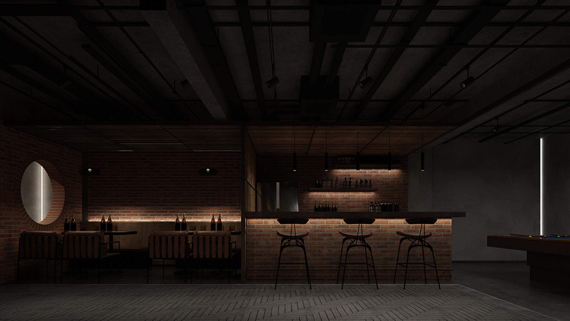 酒吧寬闊的通道讓吧臺、酒墻、沙發(fā)區(qū)分散開來,讓在不同區(qū)域活動的人在碩大的空間中找到自己的歸屬。光在整個空間中扮演著各種角色,有些讓人沉靜,有些讓人興奮。石墻、鵝卵石,最純粹的建筑元素在精心的排布和設計中發(fā)揮了其美的特點。墻面構(gòu)筑元素采用了泡沫紅陶瓷用來模擬紅磚材料,防水防火?;璋档沫h(huán)境下,人們才真正可以與世隔絕,享受自由。
