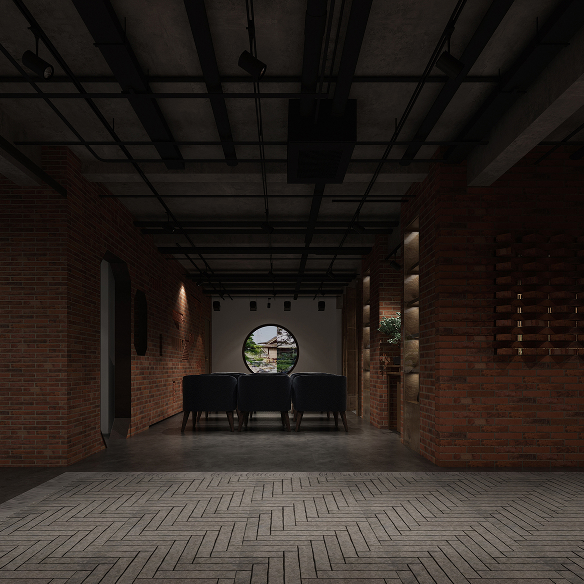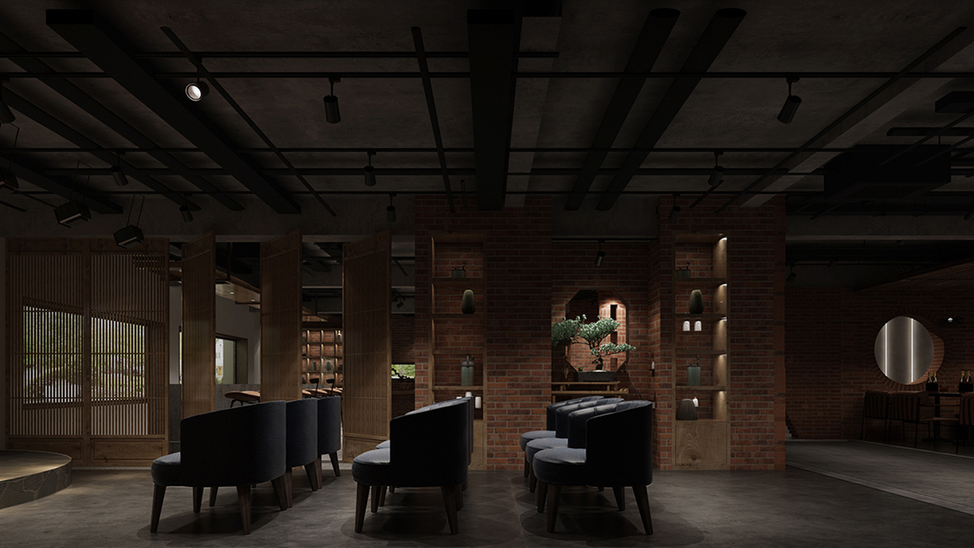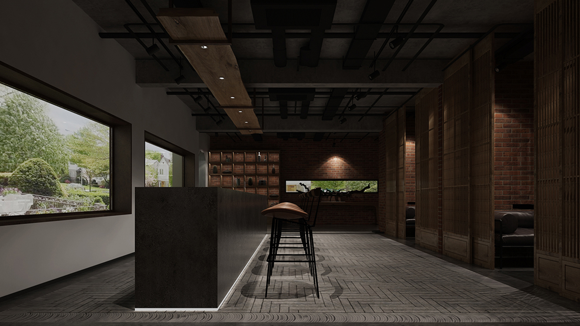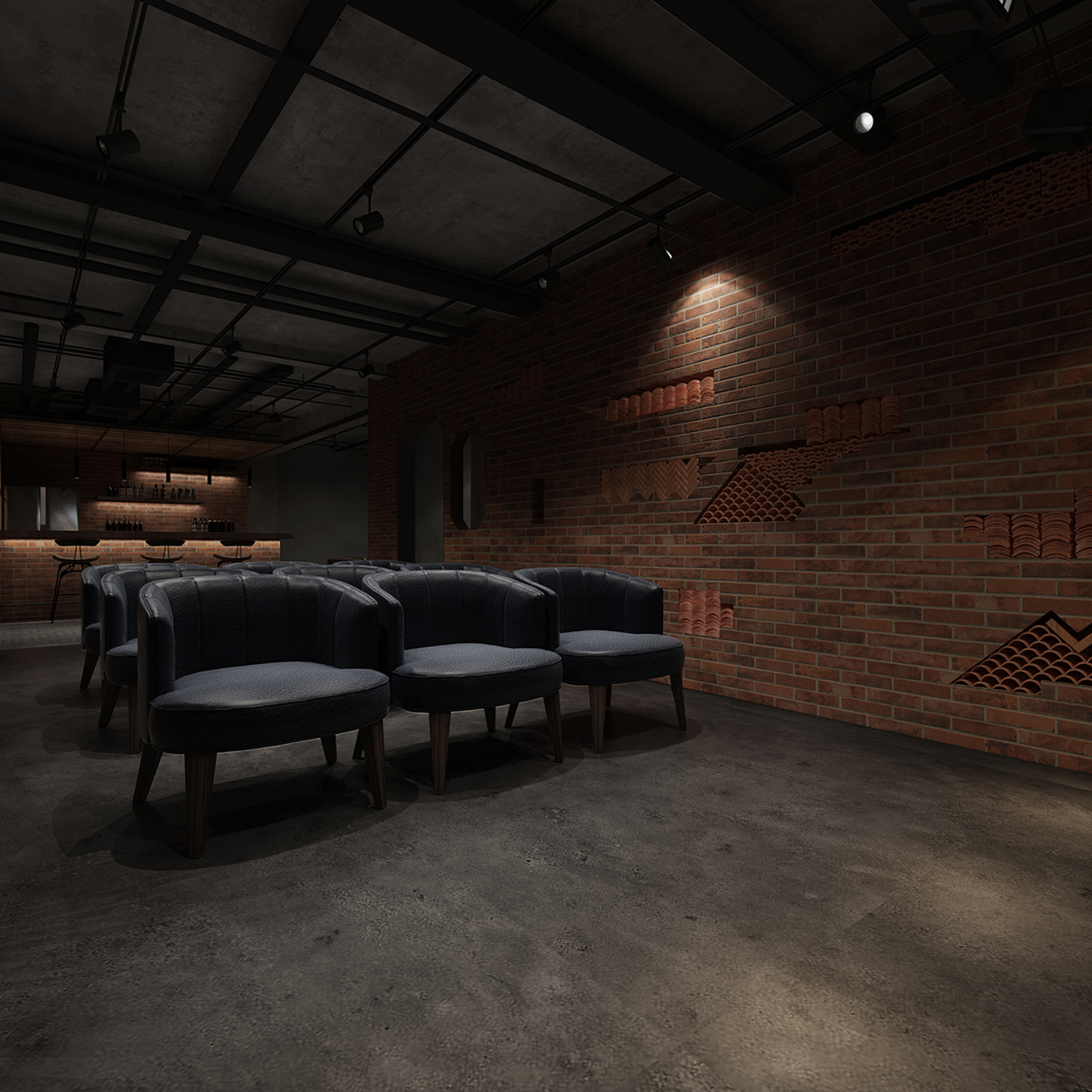 酒吧寬闊的通道讓吧臺、酒墻、沙發(fā)區(qū)分散開來,讓在不同區(qū)域活動的人在碩大的空間中找到自己的歸屬。光在整個空間中扮演著各種角色,有些讓人沉靜,有些讓人興奮。石墻、鵝卵石,最純粹的建筑元素在精心的排布和設計中發(fā)揮了其美的特點。墻面構(gòu)筑元素采用了泡沫紅陶瓷用來模擬紅磚材料,防水防火?;璋档沫h(huán)境下,人們才真正可以與世隔絕,享受自由。