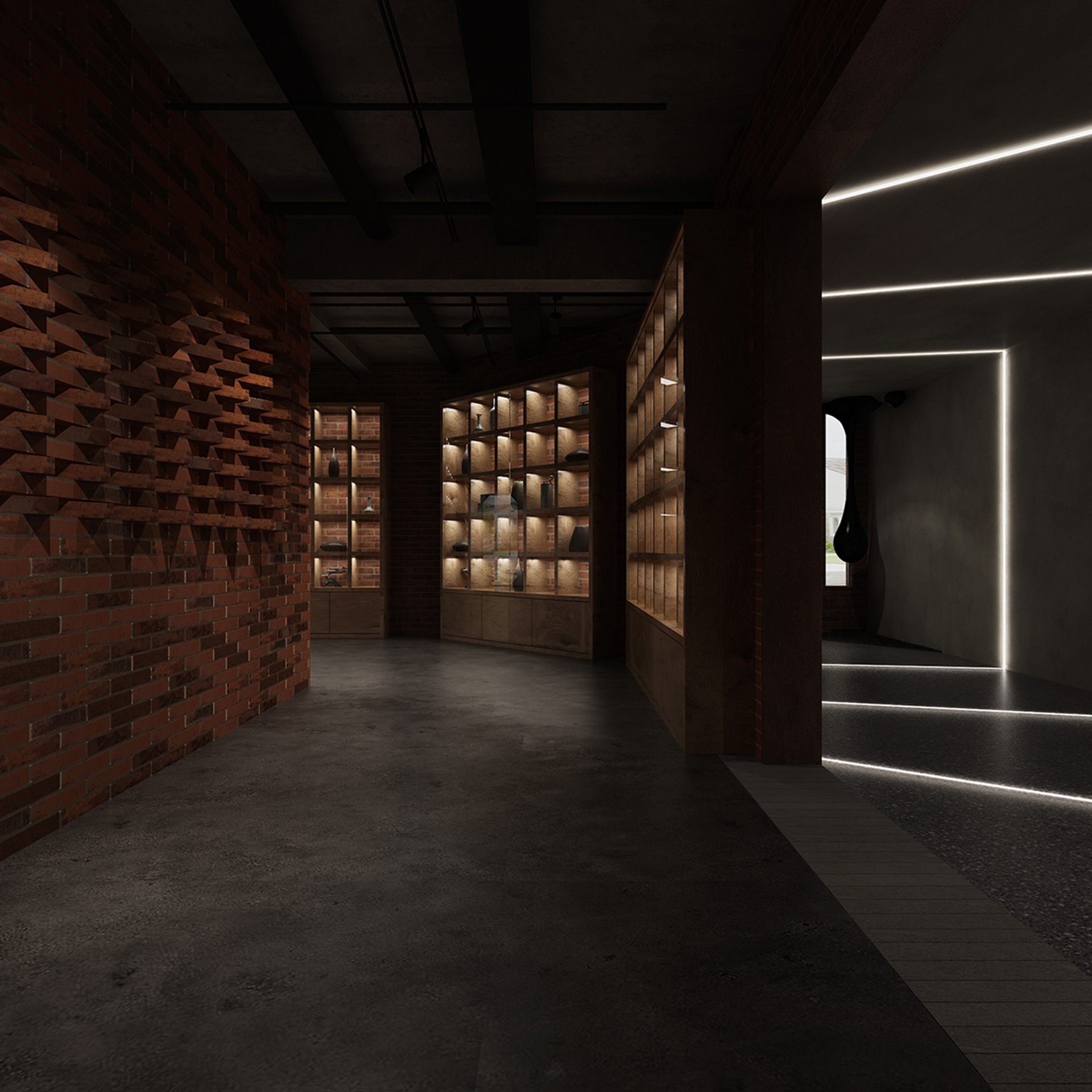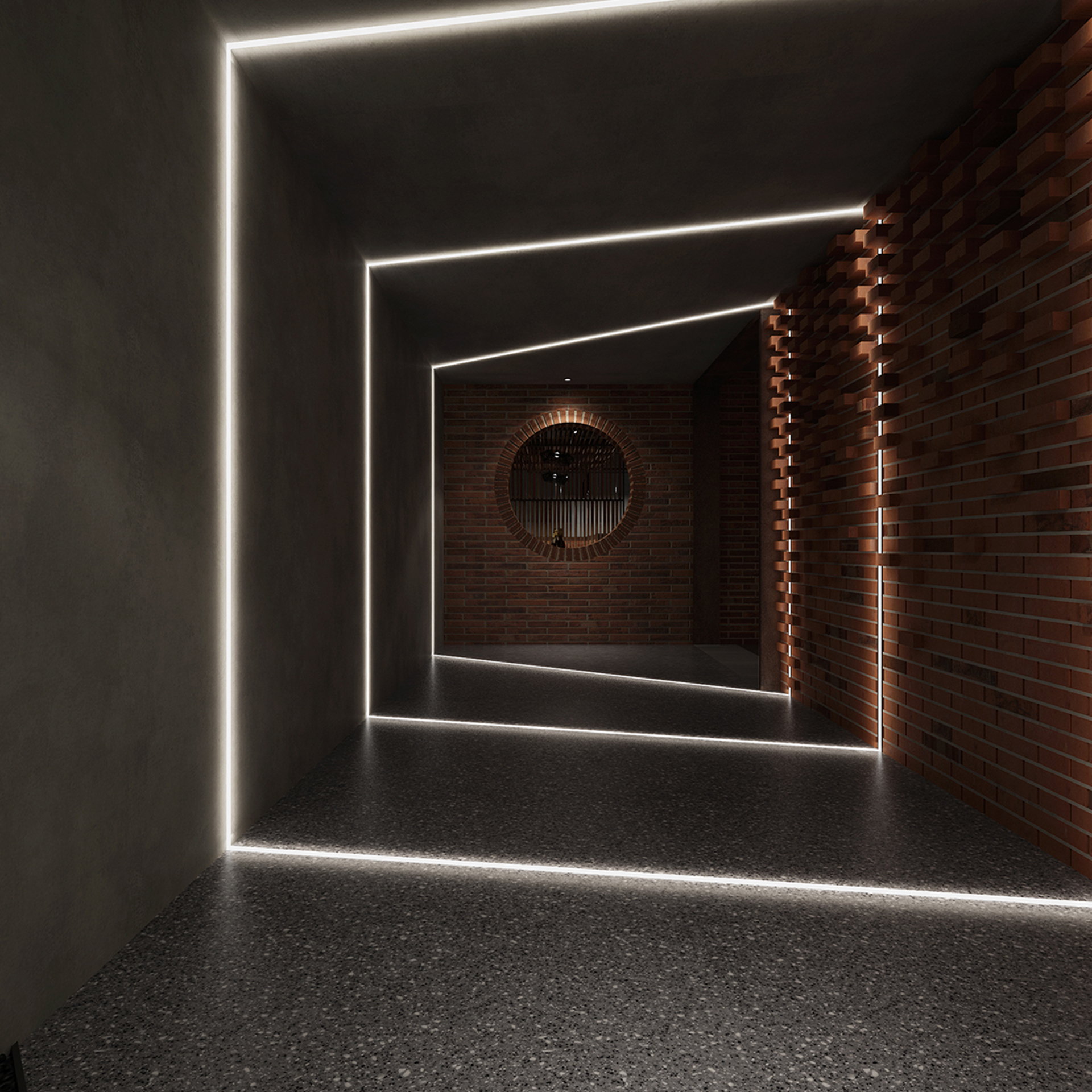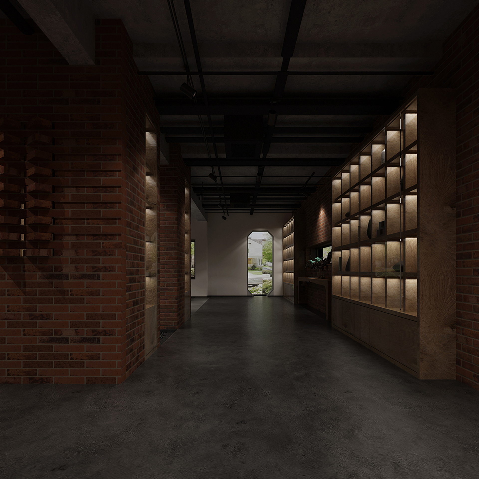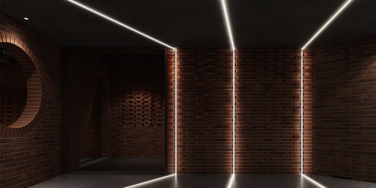 酒吧寬闊的通道讓吧臺、酒墻、沙發(fā)區(qū)分散開來,讓在不同區(qū)域活動的人在碩大的空間中找到自己的歸屬。光在整個空間中扮演著各種角色,有些讓人沉靜,有些讓人興奮。石墻、鵝卵石,最純粹的建筑元素在精心的排布和設計中發(fā)揮了其美的特點。墻面構(gòu)筑元素采用了泡沫紅陶瓷用來模擬紅磚材料,防水防火?;璋档沫h(huán)境下,人們才真正可以與世隔絕,享受自由。