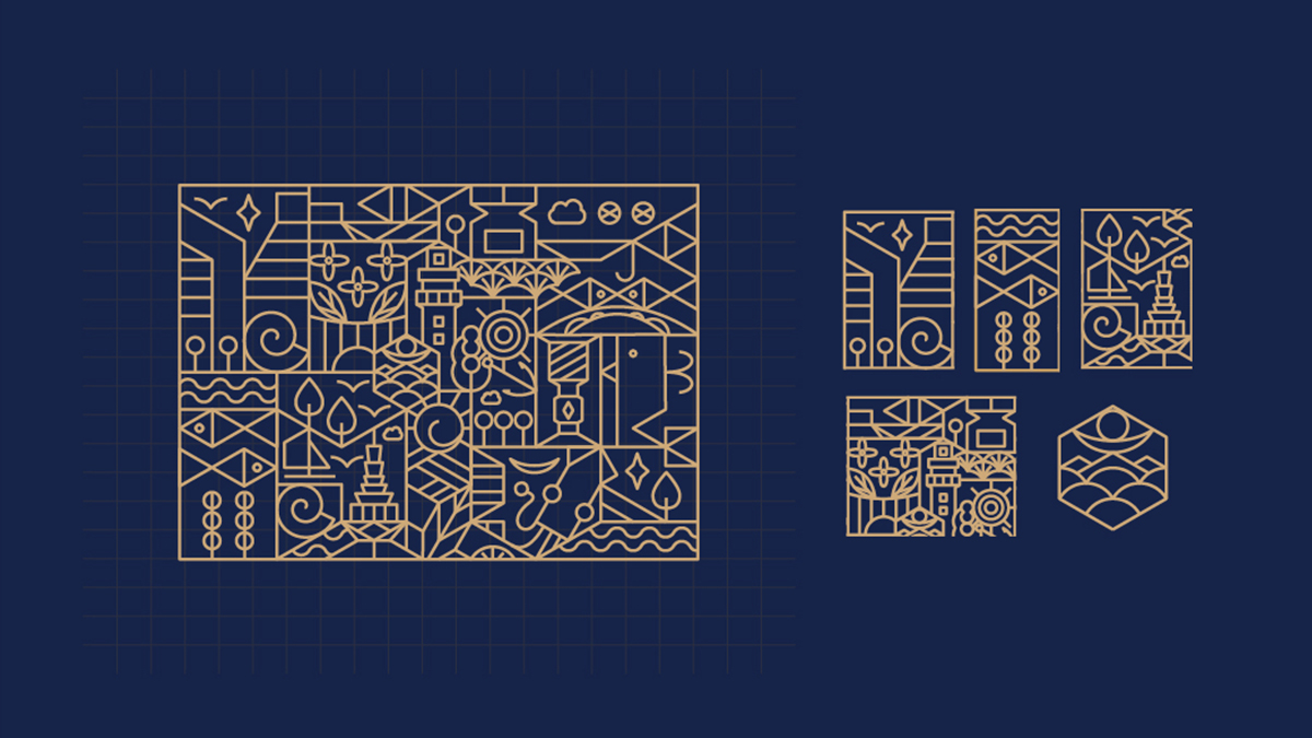 以logo為創(chuàng)意中心,發(fā)散延伸出完整的輔助畫面,組成更大的圖形。其基本構(gòu)成元素來自于日照的標(biāo)志性建筑與城市文化特色相關(guān)元素,延續(xù)線性繪畫手法以保持風(fēng)格統(tǒng)一,豐富品牌視覺表現(xiàn)力,強(qiáng)化品牌形象,以便于后期VI應(yīng)用衍生。